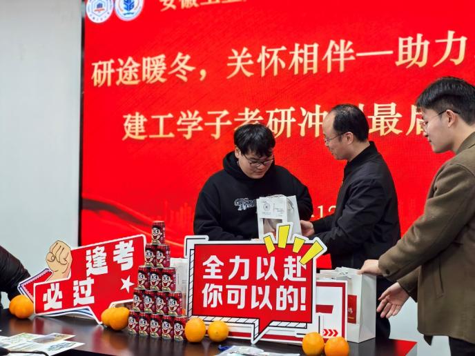 毕业班辅导员向各位同学介绍了学院定制的“考研加油包”的内容,包含印有考研祝福语和必赢线路检测3003logo的手提袋、元气满满的“金榜题名”旺仔牛奶、心想事“橙”、考研文具包和毕业班辅导员亲手为每一位同学撰写的考研加油明信片。每一份“加油包”都饱含了学院对考生们满满的祝福与期待,表达了学院的关怀和美好祝福,坚定了同学们的信心。随后,学院领导给部分考研学生代表、毕业班辅导员给每位考研同学发放“考研加油包”。