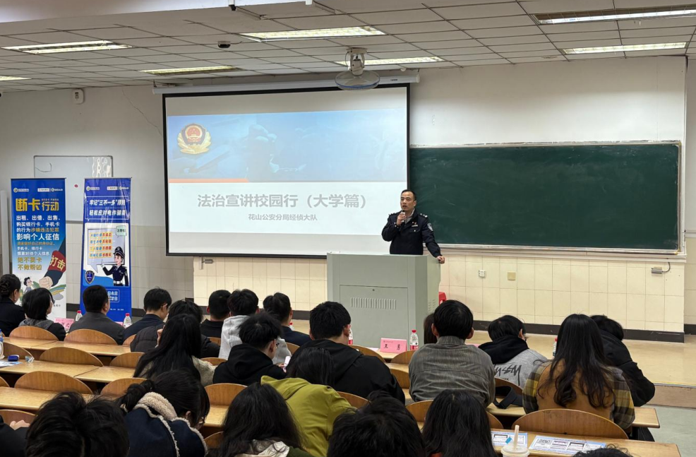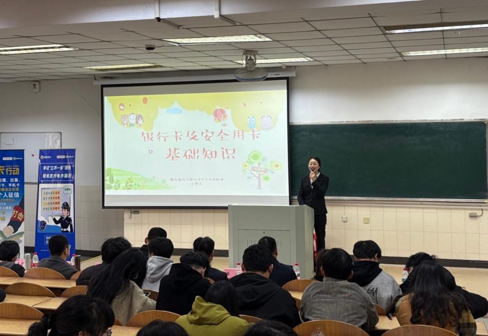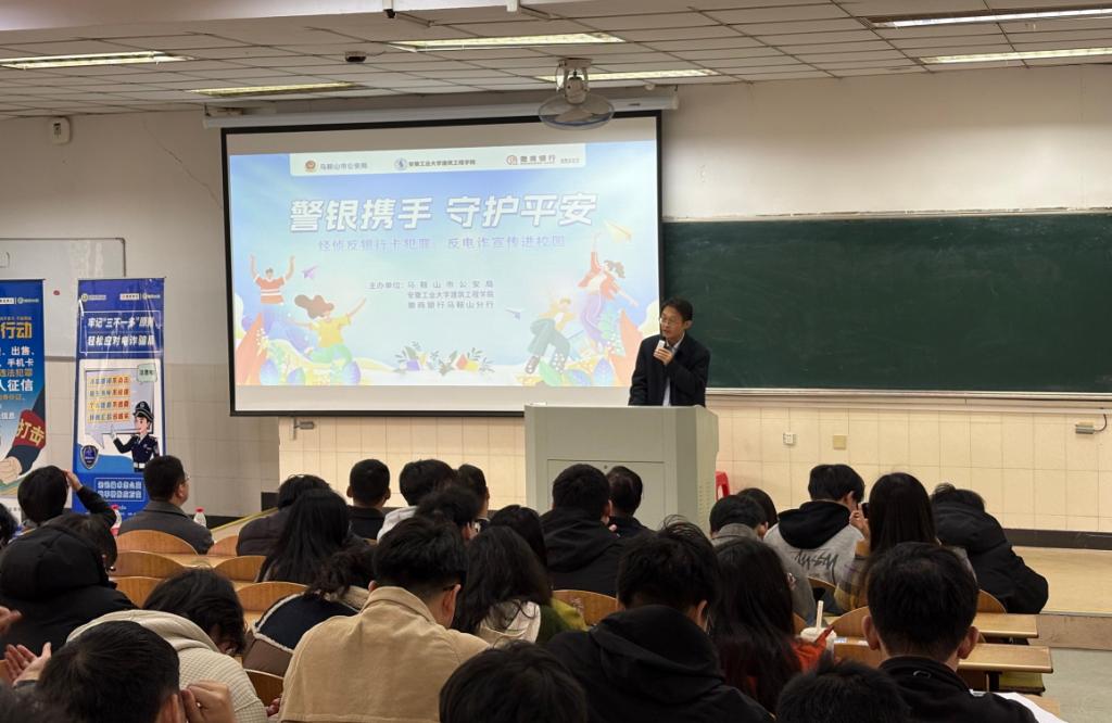 在讲座环节,马鞍山市公安局花山分局经侦大队副大队长王勇带来《反电信网络诈骗》经侦类普法宣传讲座。他结合真实案例,深入剖析了当前高发的诈骗手段与防范要点,帮助师生提升识骗防骗能力。随后,徽商银行马鞍山分行个人金融部主管王静文开展《安全用卡意识提升》讲座,围绕金融安全知识、规范用卡习惯等方面进行讲解,引导师生远离金融风险。