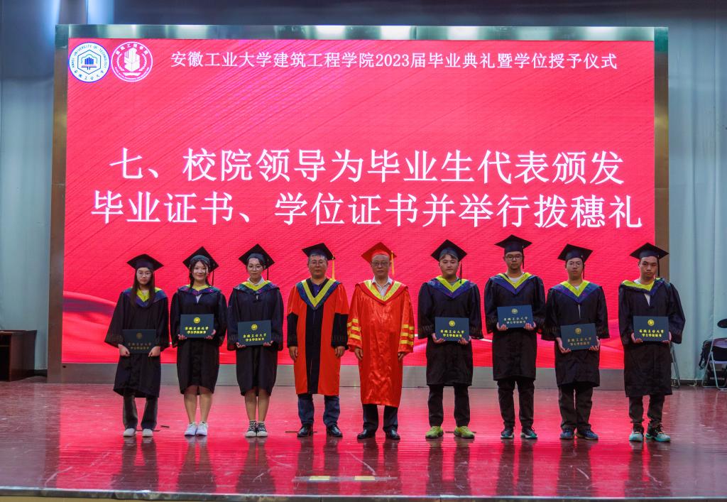 校院领导、导师依次为2023届毕业生代表拨动帽穗、颁发学位证书,并与他们合影留念。典礼在嘹亮的《建苑院歌》中圆满落幕。