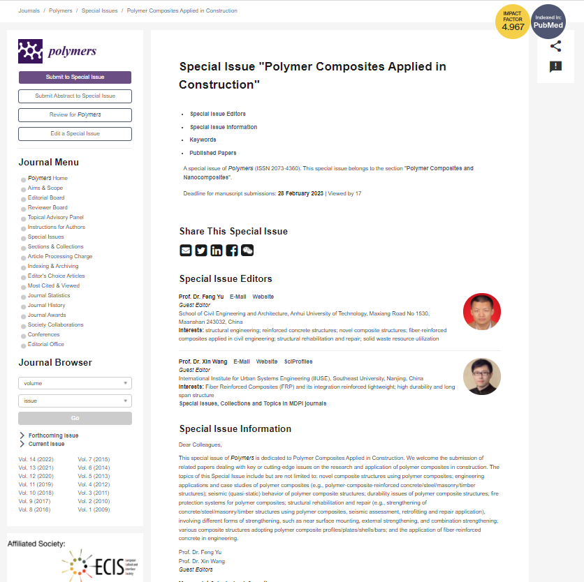 近日,国际知名MDPI出版集团旗下Polymers期刊向我院于峰教授发出邀请函,聘请其担任《Polymer Composites Applied in Construction》特刊客座编辑(Guest Editor)