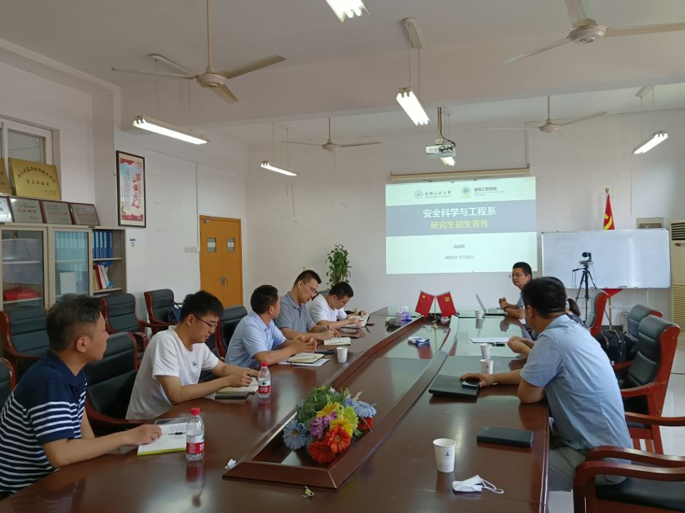 研讨会上,刘辉简要介绍了学校和学院的发展历史、师资队伍、学科建设等情况,详细介绍了安全工程专业的师资队伍、学生培养、学科方向、研究平台、招生及就业情况等,特别说明了安全工程专业历次认证情况,就历次专业认证的要点和经验进行了细致介绍。林晓飞详细介绍了我院安全工程专业的办学历史、师资队伍、招生与就业、专业特色和科研等情况。双方重点围绕一流学科建设、专业认证的相关问题进行了深入交流,特别学科建设、实习实训、师资培养、招生就业等方面进行了详细的了解和探讨。此外,冯俊军还进行了冶金环境安全专业研究生招生宣讲。