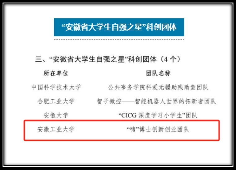 我院“啸”博士创新创业团队荣获“安徽省大学生自强之星”科创团体,并被安徽省推荐成为“中国大学生自强之星”候选科创团体。
