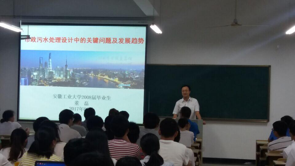 2017年6月11日晚7时,我校2008届优秀毕业生、上海市政设计研究总院校友董磊在建工南楼511为给排水科学与工程专业的师生做了题为“市政污水处理设计中的关键问题及发展趋势”的学术报告。市政工程系部分老师、硕士研究生及13、14级本科生参加了报告会。